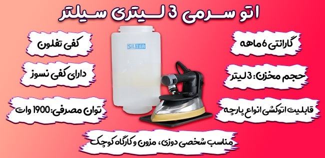 اتو سرمی 1900وات **سیلتر** مدل SILTER** 1900W SL-300-3L** همراه با فیلتر آب بیرونی و قابل تعویض و کفی پهن ستاره ای قابل تعویض اصل، بهترین و باکیفیت ترین برند اتو سرمی، گارانتی طلایی به تمام لوازم اضافی و فابریکی و یک عدد هدیه (پس کرایه)