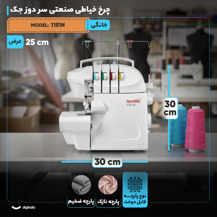 چرخ خیاطی سردوز نیولایف مدل 1151N بهعنوان یک چرخ خیاطی صنعتی طراحی شده است تا دوختهای سردوزی و پسدوزی را با دقت و سرعت بالا اجرا کند. ساختار چرخ خیاطی سردوز نیولایف مدل 1151N با ارتفاع 30 سانتیمتر، طول 30 سانتیمتر و عرض 25 سانتیمتر تولید شده و وزن 7.9 کیلوگرم ثبات مناسبی روی میز کار ایجاد میکند. اسکلت داخلی از جنس آلومینیوم ساخته شده تا دوام و استحکام دستگاه تقویت شود و بدنه خارجی فایبرگلاس نیز وزن را کاهش داده و مقاومت در برابر فشارهای محیطی را افزایش میدهد. کنترلهای چرخشی و دکمهای در چرخ خیاطی سردوز نیولایف مدل 1151N امکان تنظیم دقیق پارامترهای دوخت را فراهم میکند. حداکثر سرعت 1000 کوک در دقیقه در چرخ خیاطی سردوز نیولایف مدل 1151N برای کاربری نیمهحرفهای و صنعتی سبک مناسب است و زمان اجرای پروژهها را کاهش میدهد. تنظیم طول دوخت تا 5 میلیمتر و عرض دوخت تا 6 میلیمتر نیز انعطاف زیادی برای دوخت لبهها، محکمسازی درزها و ایجاد لبهدوزیهای دقیق ارائه میدهد. پشتیبانی از سوزنهای ha در سایز 9 تا 16 استفاده از چرخ خیاطی سردوز نیولایف مدل 1151N را برای پارچههای ضخیم، نازک و تکهدوزی امکانپذیر میکند. قابلیت بهرهگیری از دو، سه یا چهار نخ در چرخ خیاطی سردوز نیولایف مدل 1151N اجازه میدهد نوع دوخت با توجه به نوع پارچه و استحکام مورد نیاز انتخاب شود. وجود کارپیشبر قابل تنظیم، اجرای منظم دوخت را روی پارچههای کشی یا لغزنده ممکن میسازد. این دستگاه علاوه بر سردوزی و پسدوزی، قابلیت دوختهایی مانند لبدوزی لول، ژوردوزی، قیطاندوزی، کشدوزی، چیندوزی، دوخت نامرئی و مرواریددوزی را فراهم میکند. محفظه جمعآوری پرز نیز برای حفظ نظافت مسیر نخ و افزایش عمر قطعات در چرخ خیاطی سردوز نیولایف مدل 1151N تعبیه شده است. کلیدهای ایمنی و میکروسوئیچ ایمنی در ساختار چرخ خیاطی سردوز نیولایف مدل 1151N وظیفه جلوگیری از عملکرد ناگهانی دستگاه را برعهده دارند. اقلام همراه شامل پدال، پایه دوخت و دفترچه راهنما تکمیلکننده مجموعه هستند.